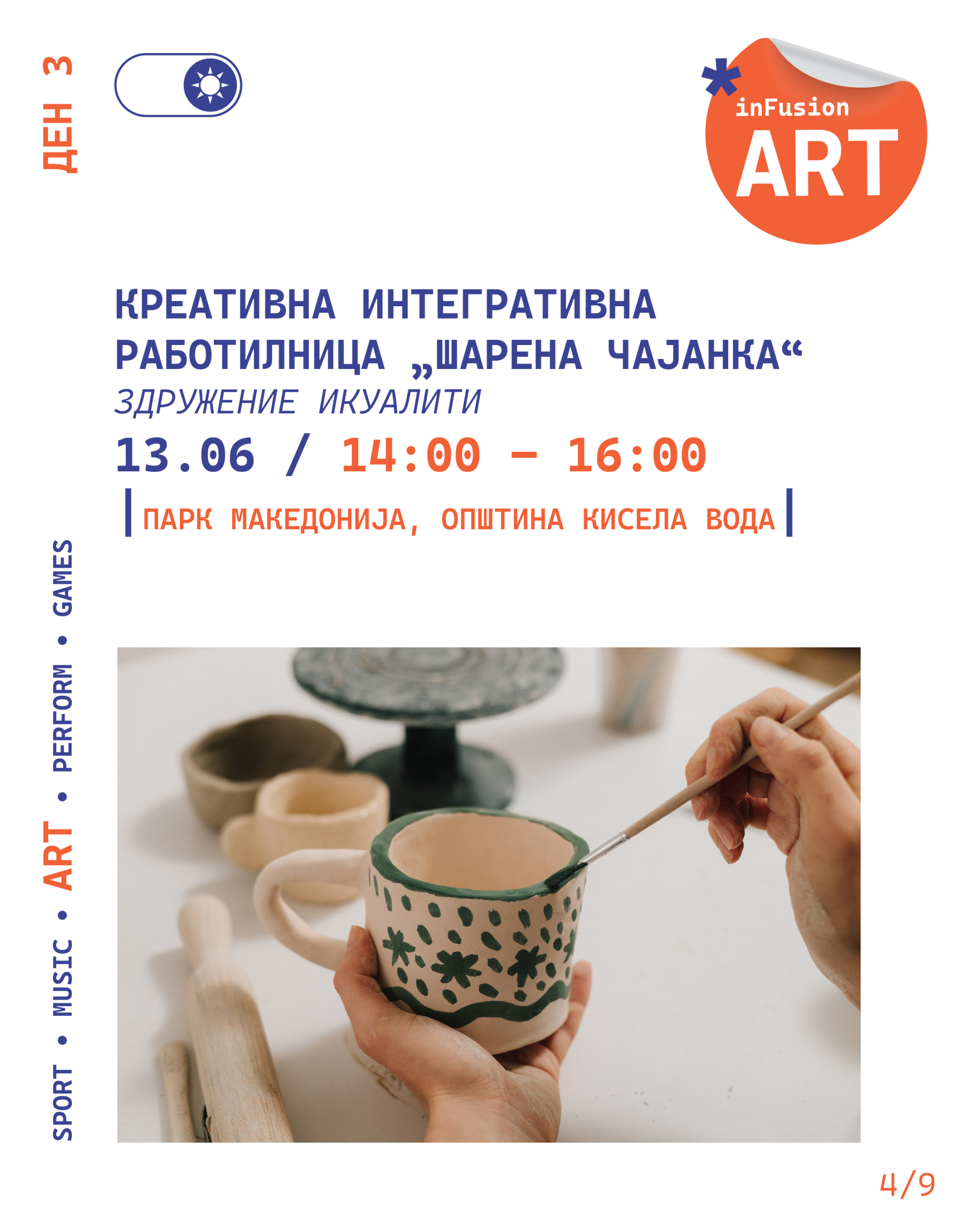 As part of inFUSION – 4th Festival of Inclusion, on June 13, 2025, from 14:00 to 16:00, the creative and integrative workshop “Colorful Tea Party” will be held, where children and youth aged 10 to 18 years will have the opportunity to draw and decorate coasters together and awaken their artistic spirit. The workshop encourages collaboration between youth with and without disabilities, creating an inclusive space for socializing, exchanging ideas, and making new friends. Additionally, each participant will be able to take home their uniquely decorated coaster – a memory of a beautiful afternoon filled with friendship and positive energy.